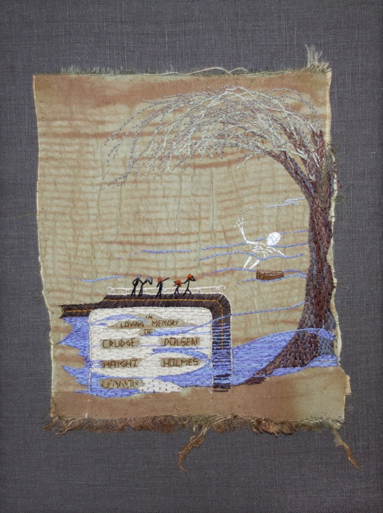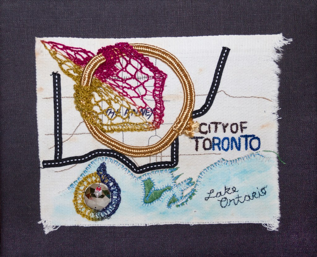 There seemed no better way to illustrate The Bones than through stressing common Ontario Loyalist textiles after they are embroidered with traditional stitches. Less traditional materials are used to highlight Catherine’s daughter’s views. And then there are emboideries on silk with somewhat Gothic representations that link to another character and the silk memorial embroideries that would have been popular with Loyalists after the War of 1812.