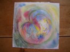 I’m wondering about potential, about energy explosions and implosions, big bangs and black holes. I’m looking about my studio space and at the number of projects that remain visible, that swirl in space. There is a sense of organization into two camps — painting and sewing. The easel and the sewing machine are both accessible. Horizontal surfaces are covered in piles of stuff.